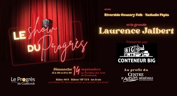 Le Progrès de Coaticook est fier de vous inviter à la 2e édition du Show du Progrès, un spectacle-bénéfice mettant en vedette les artisans du Progrès de Coaticook. Cette année, c’est la grande Laurence Jalbert qui viendra terminer la soirée avec nous. Un évènement d’une d’une grande qualité que vous ne voulez pas manquer.