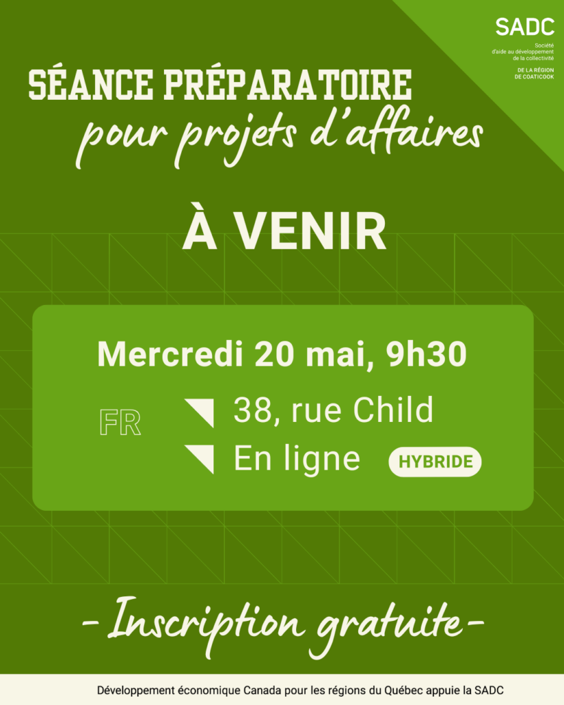 Lors de la séance, vous apprendrez ce que ça représente être entrepreneur et comment démarrer votre projet. Un survol des ressources et des programmes de soutien disponibles dans la région de Coaticook pour vous accompagner bouclera la rencontre.