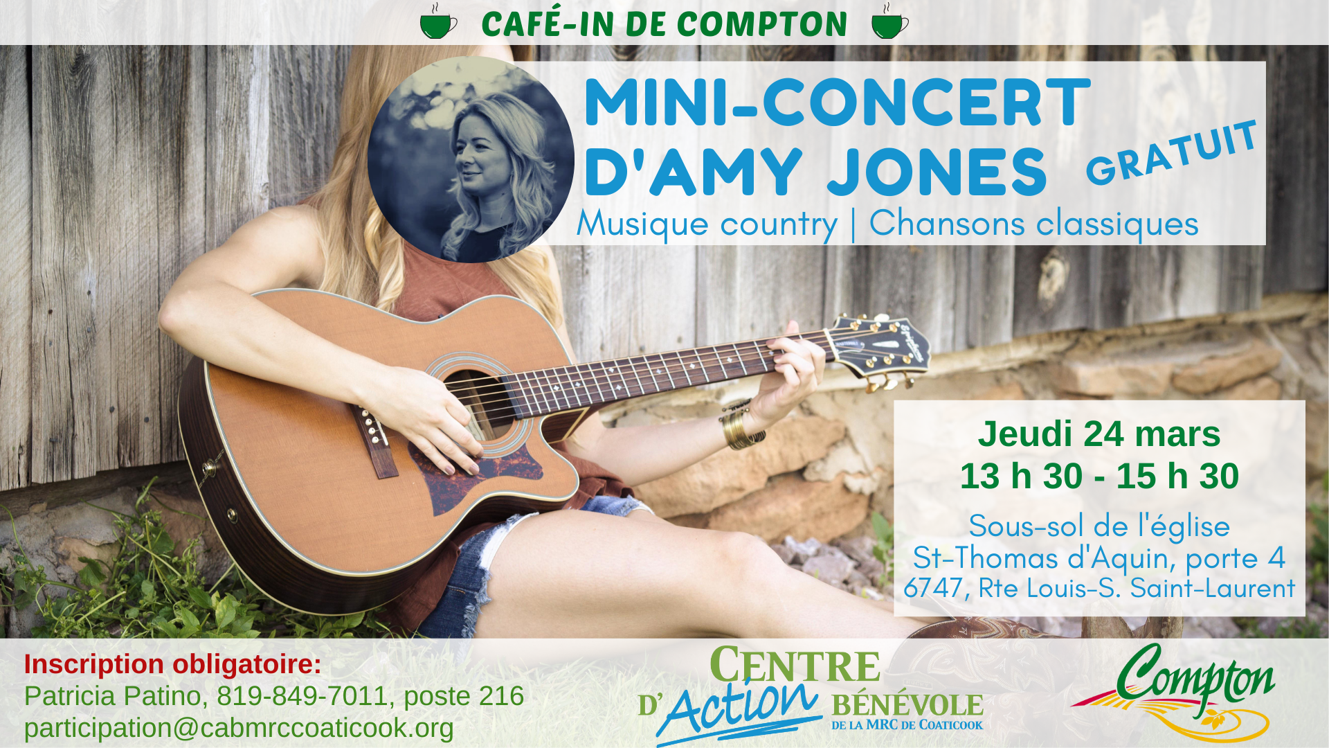 Le Café-In, la municipalité de Compton et le Centre d'action bénévole vous invitent à un mini-concert gratuit d'Amy Jones. Au programme : guitare, musique country et chansons classiques. Inscription obligatoire : Patricia Patino au 819-849-7011, poste 216, ou [...]
